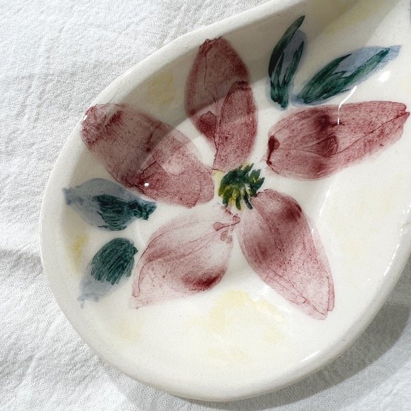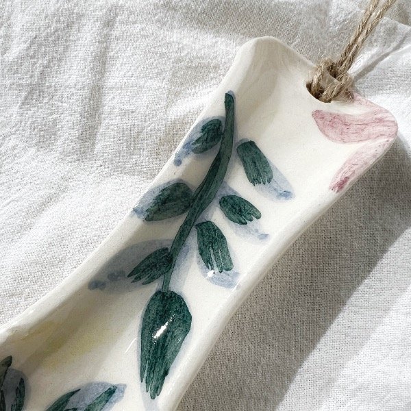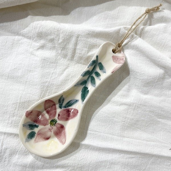 Apoya cuchara con base en color natural y flores hechas a mano que le dan un diseño primaveral. Con piolín de yute para poder colgar y decorar tu cocina además de usarlo cuando lo necesites.